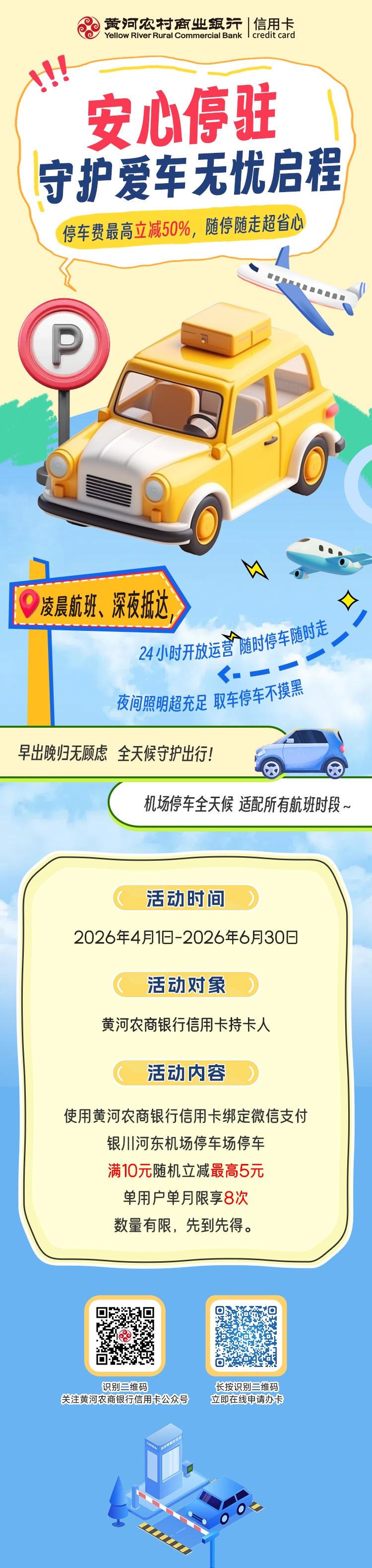 【安心停驻】深夜航班也不怕!刷黄河农商银行信用卡,银川河东机场停车费最高立减50%,随停随走超省心!